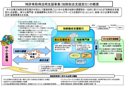経済産業省では地域の中小企業等における特許等の知的財産支援は、利用する中小企業等からみると「適切な窓口がわかりづらい」、「知的財産は専門性が高く相談に行きにくい」といった声に応え、中小企業等が企業経営の中で抱えるアイデア段階から事業展開までの知的財産に関する悩みや課題を一元的に受け付け、知的財産に携わる様々な専門家や支援機関と共同してその場で解決を図るワンストップサービスを提供する事業を平成23年度から実施する予定。