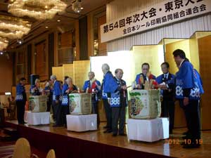 全日本シール印刷協同組合連合会主催の「第54回年次大会・東京大会」は、10月19日(金)に、「浅草ビューホテル)に於いて、当組合の担当で開催され、厳しい経済状況の中にもかかわらず、全国から組合員・会友など400名を越える参加者が集いました。
