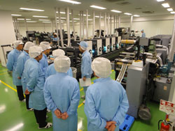 一行は用意されたクリーン服とキャップを着用した後、三班に分かれて工場を見学、最新鋭のスクリーン印刷機やシール印刷機、各種製版機、カメラ付印刷機の実演、カメラ位置合わせ抜きのデモ印刷等々を見学しましたが、その規模と工場内の環境への配慮にただただ驚くばかりでした。